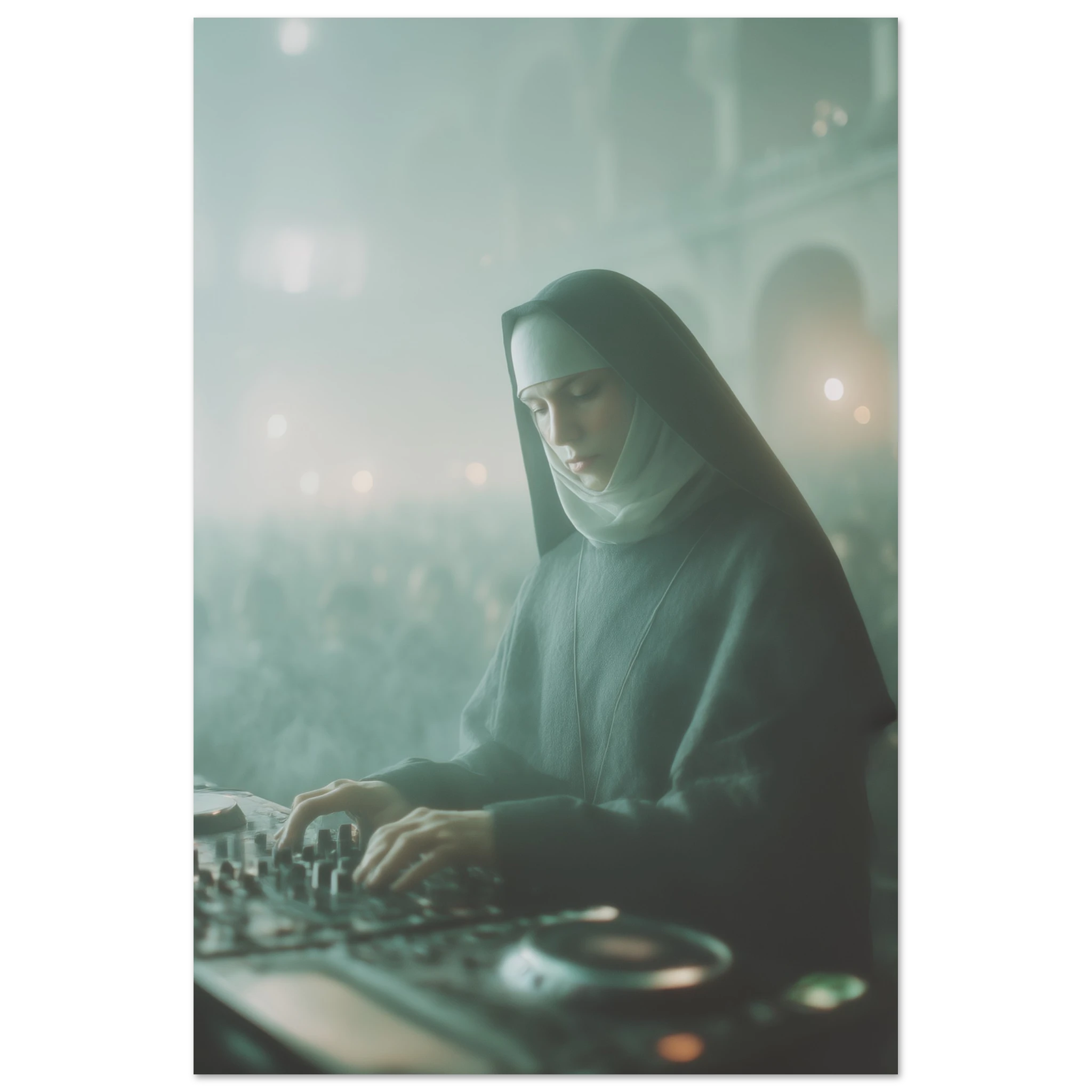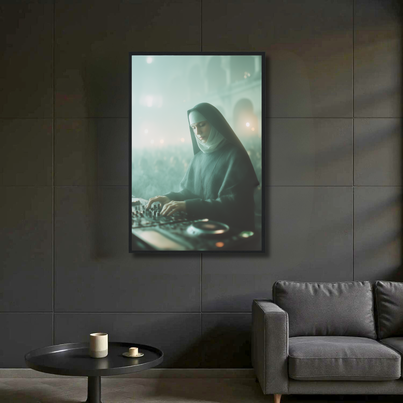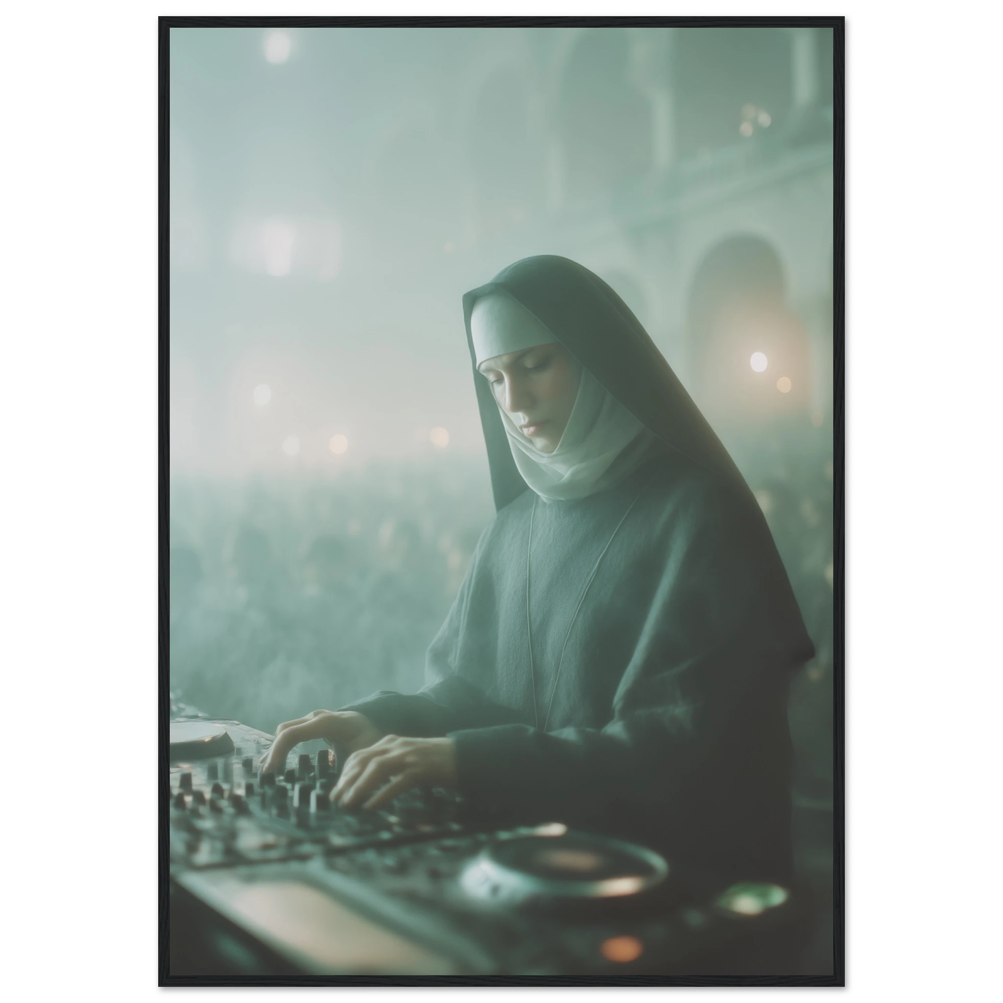 She stands still, cloaked in quiet reverence, hands dancing across the decks like a sacred ritual. In the haze of devotion and bass, she confesses not with words but through rhythm, a sermon of sound for the night-hearted.