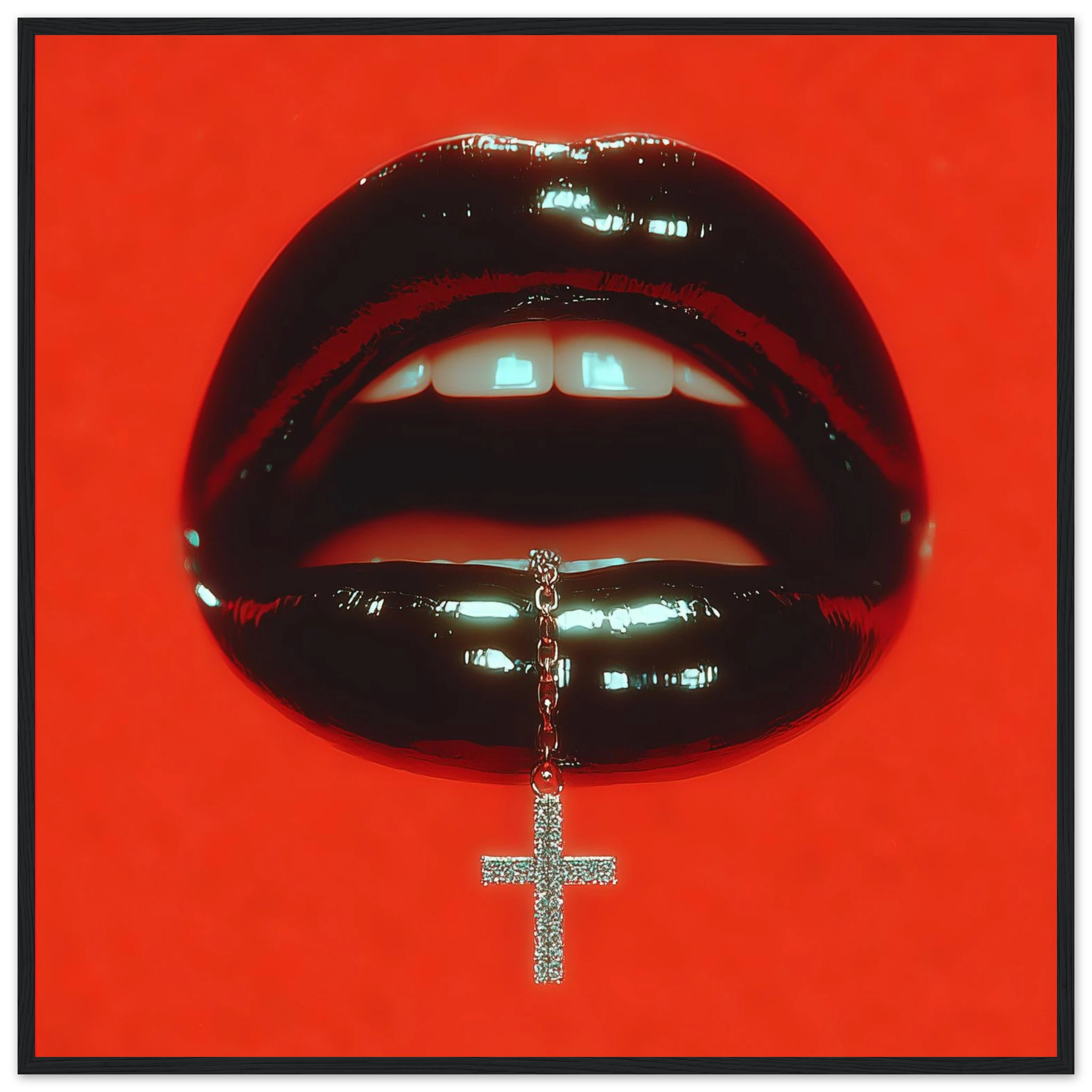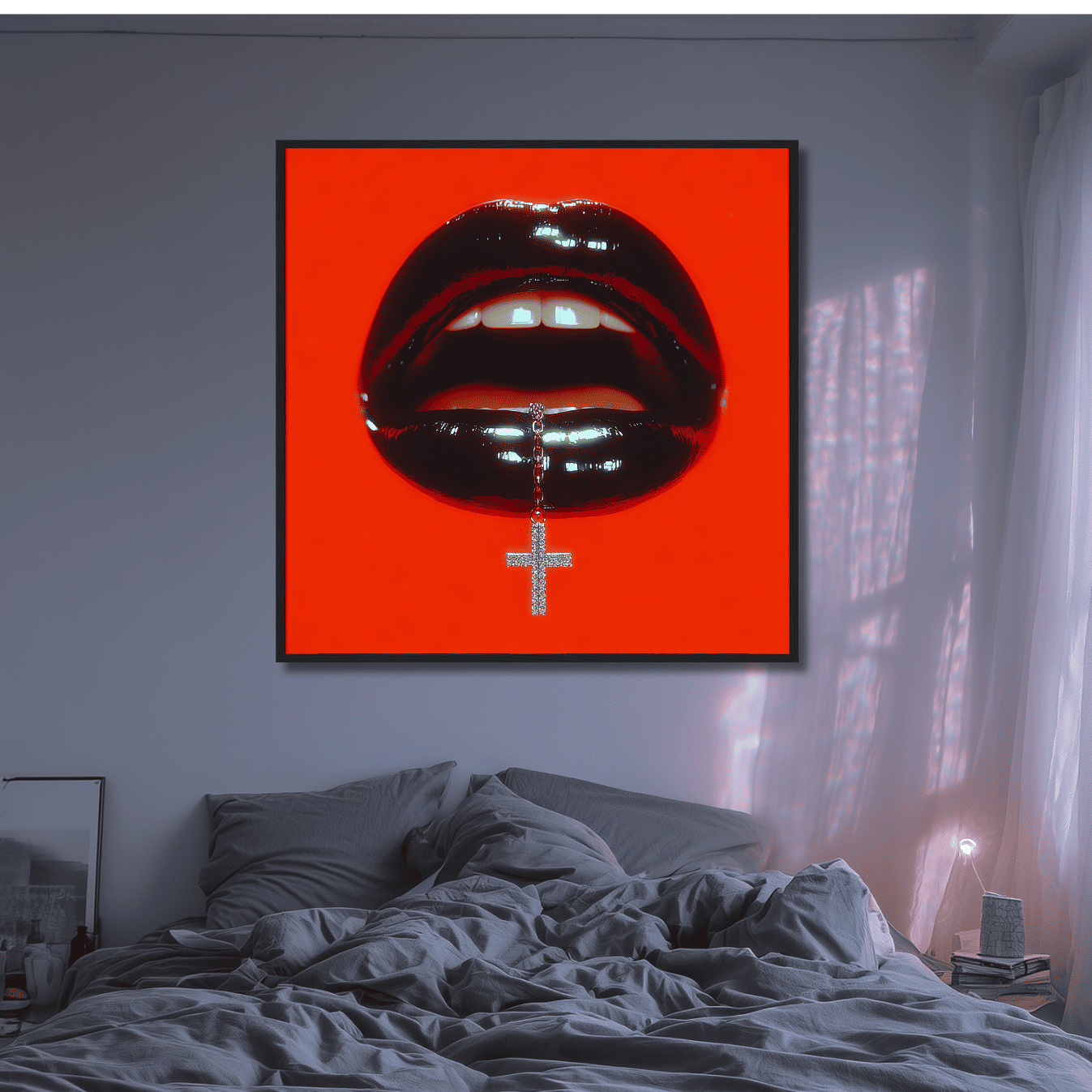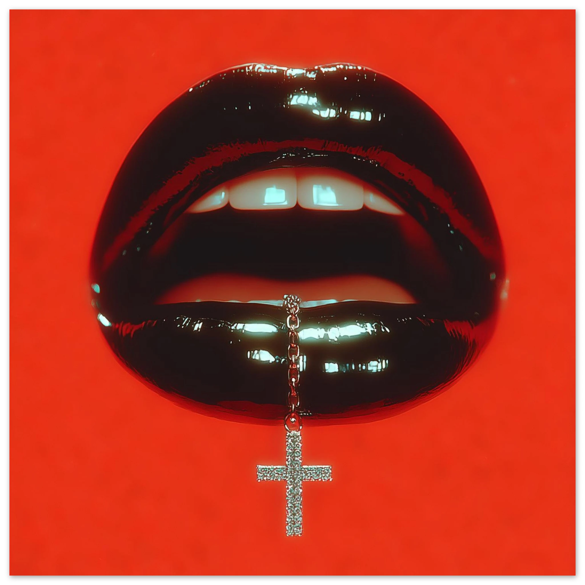 She turns reverence into rebellion, sanctity into seduction. The cross dangles not as submission, but as a dare.