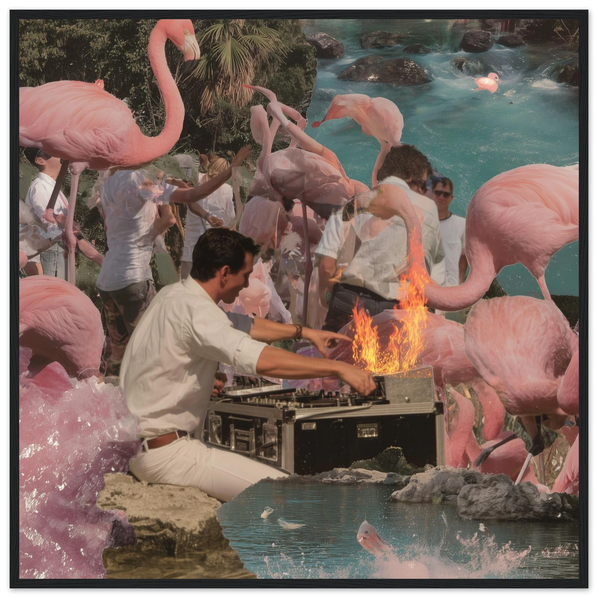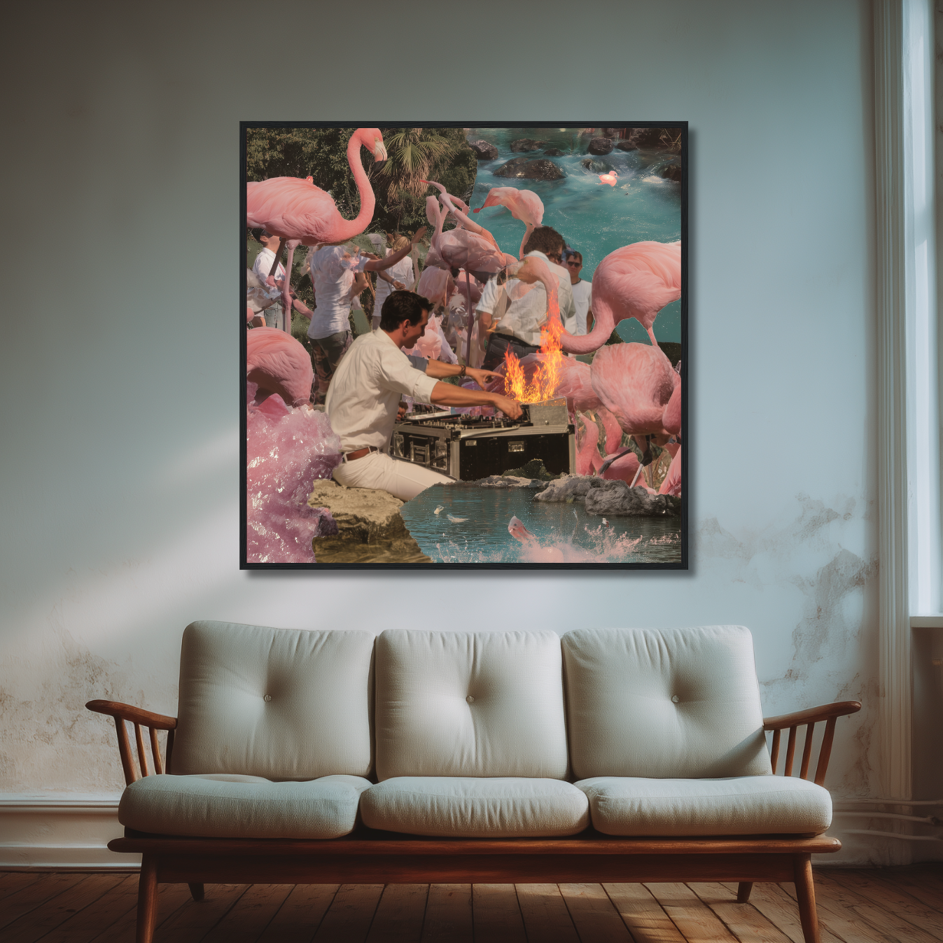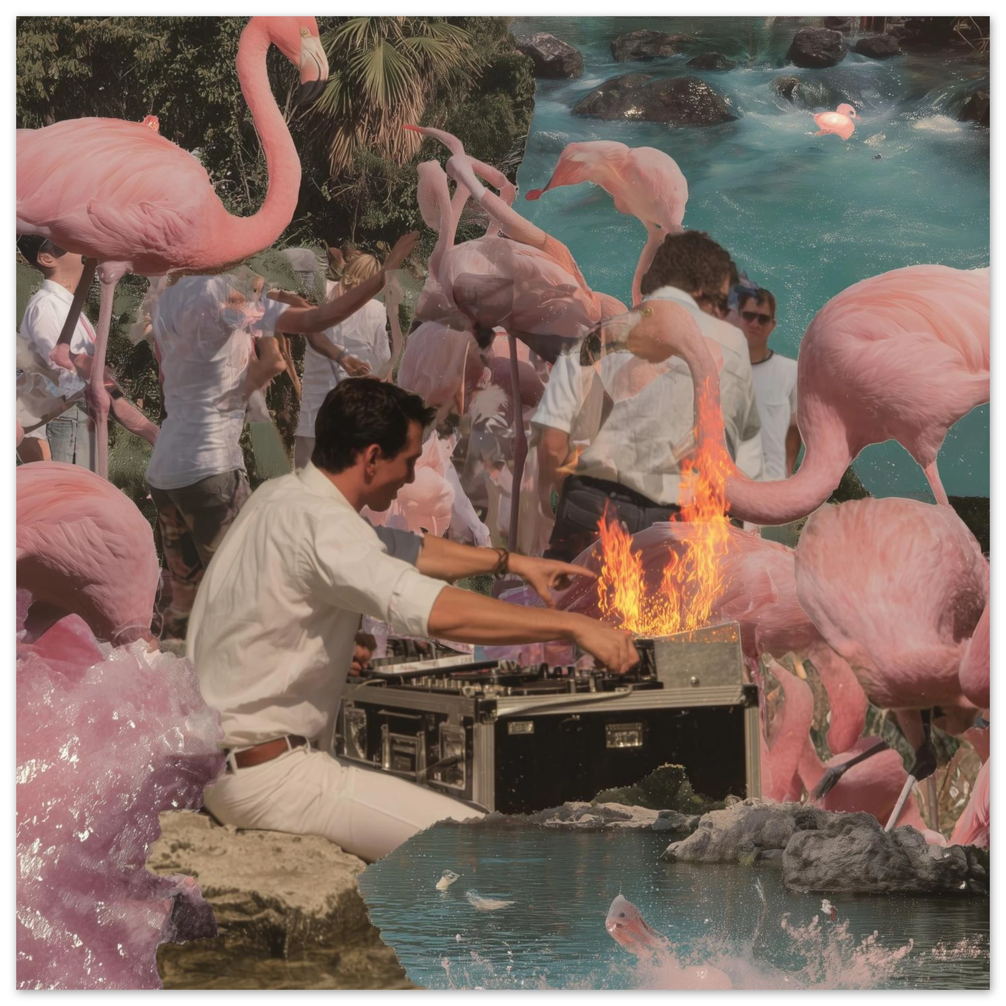 "DJ Flamingo" spins a surreal soundtrack to the unexpected. Flamingos riot in pink across an idyllic beach scene while the DJ keeps calm at the decks, his gear on fire, he seems unbothered