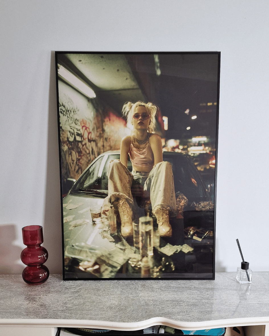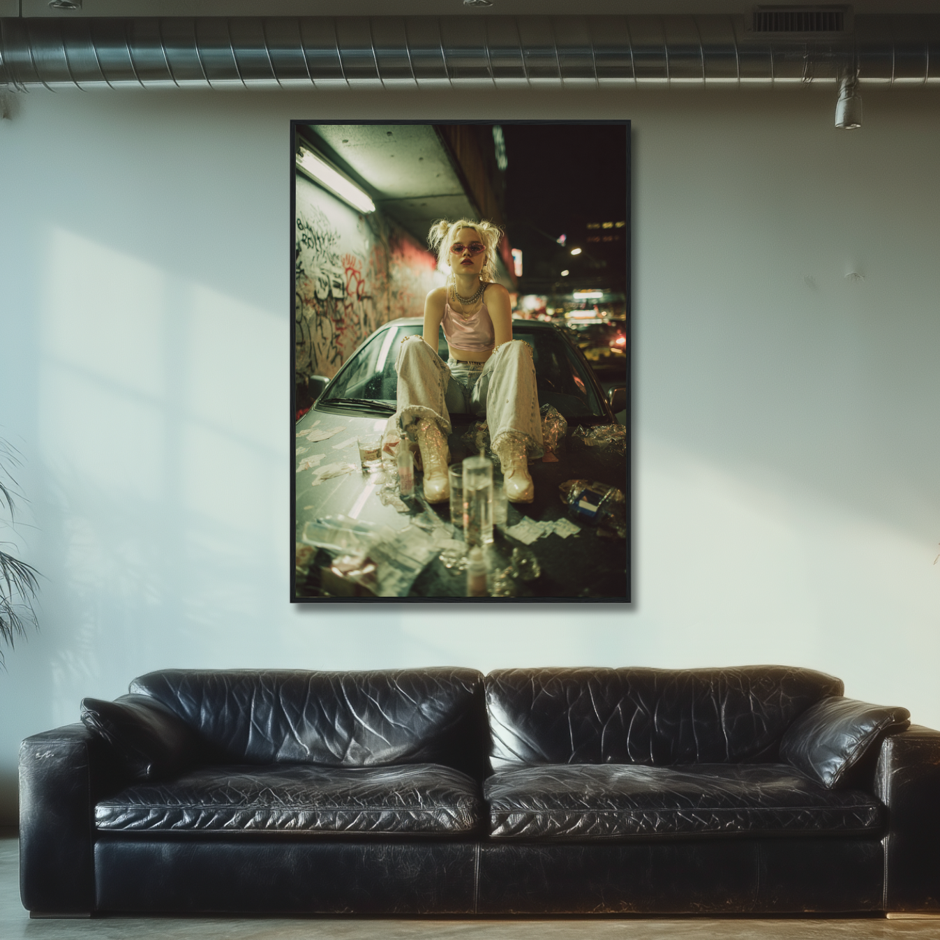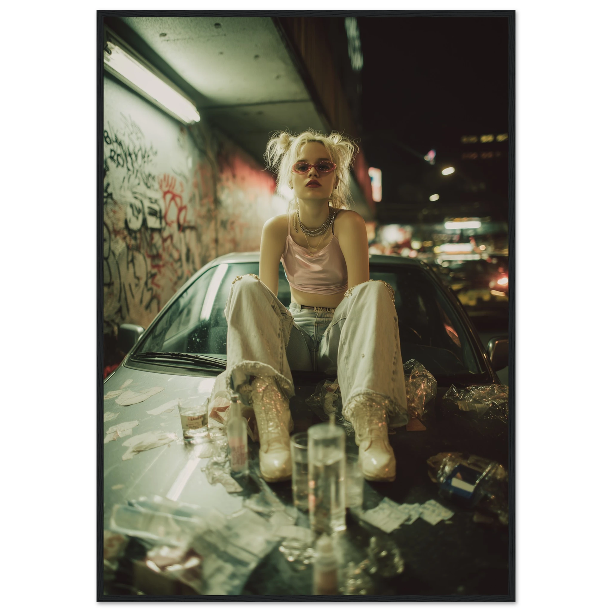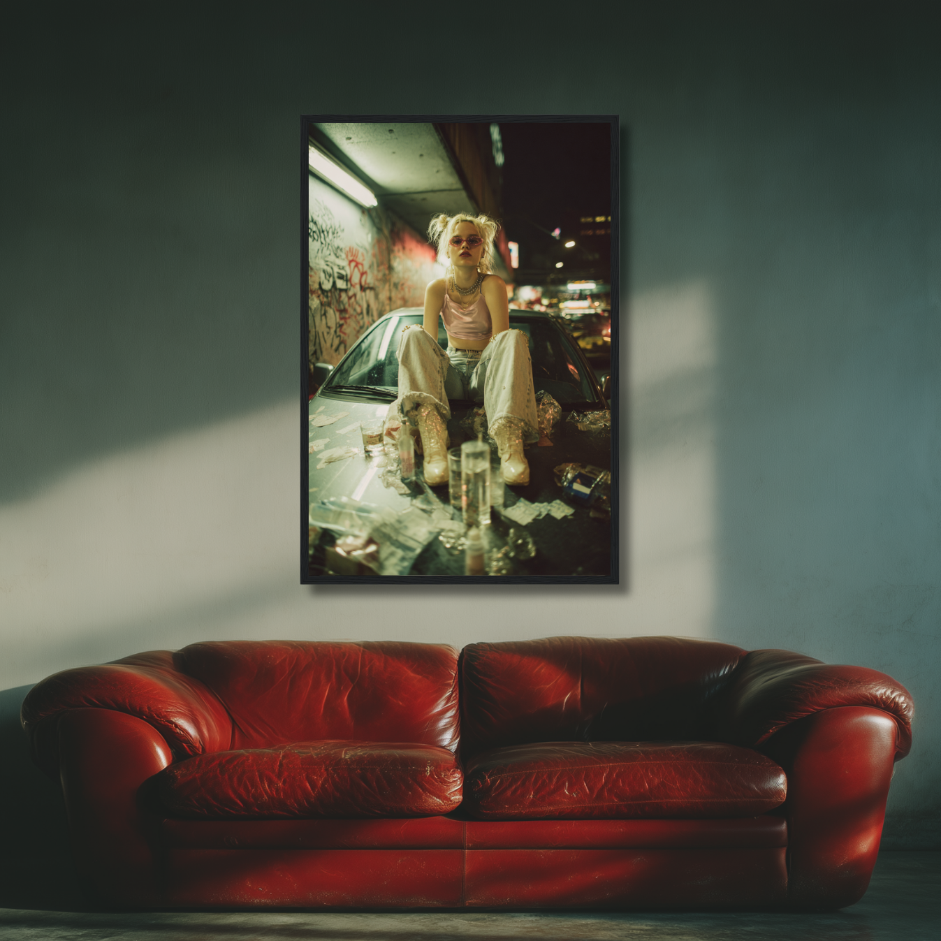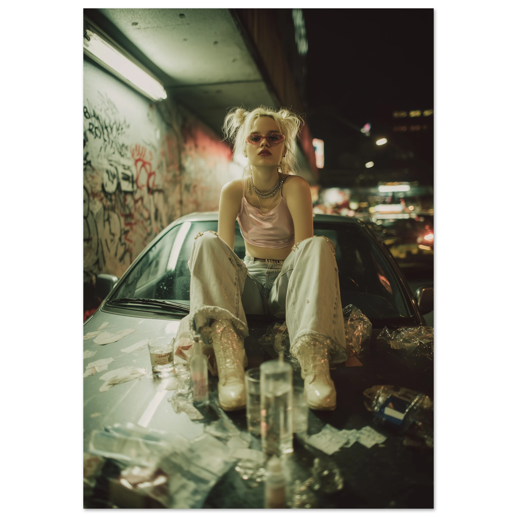 The rave is over, but she stays lit. Posted up on the hood like it’s a throne, surrounded by last night’s chaos.