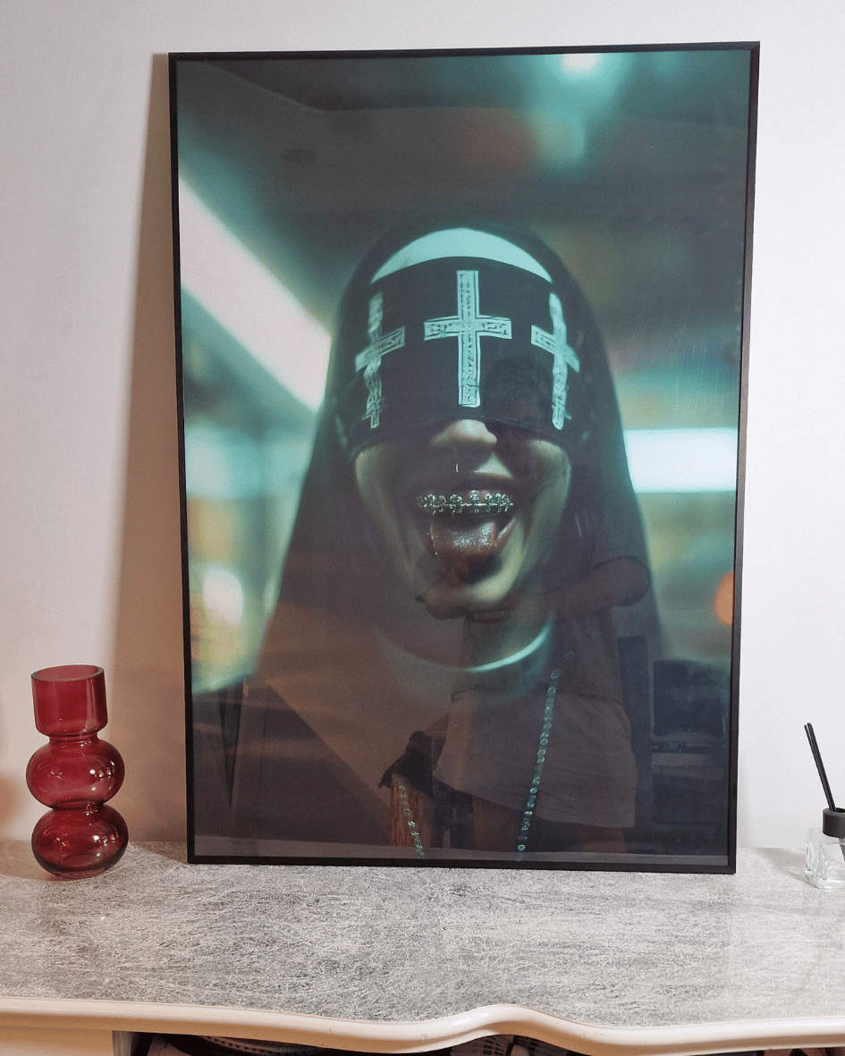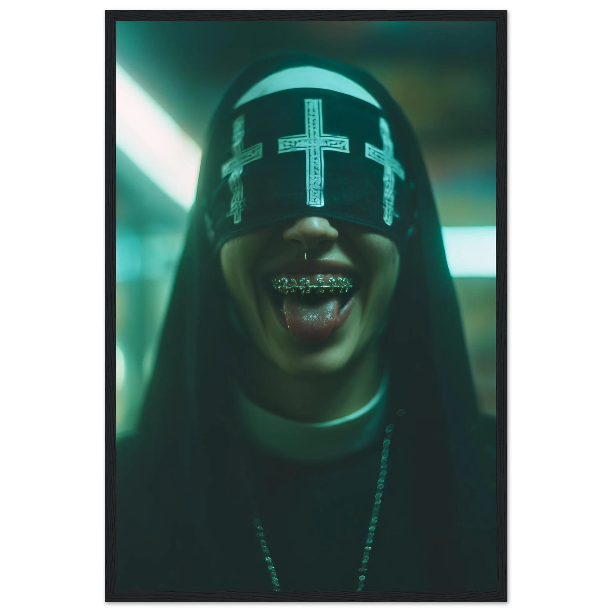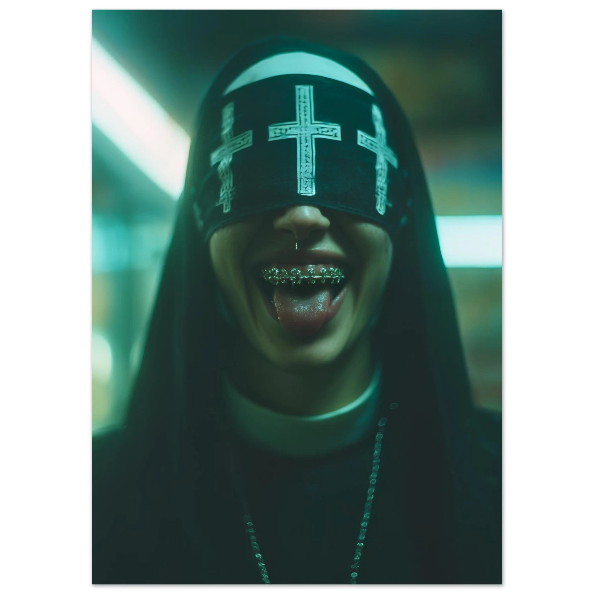 She took a vow of silence, then bit her tongue and laughed. A midnight icon wrapped in ritual and rebellion, this piece dares you to question every rule you've ever blindly followed. Eyes covered, mouth open, she’s not here to preach, she’s here to provoke.