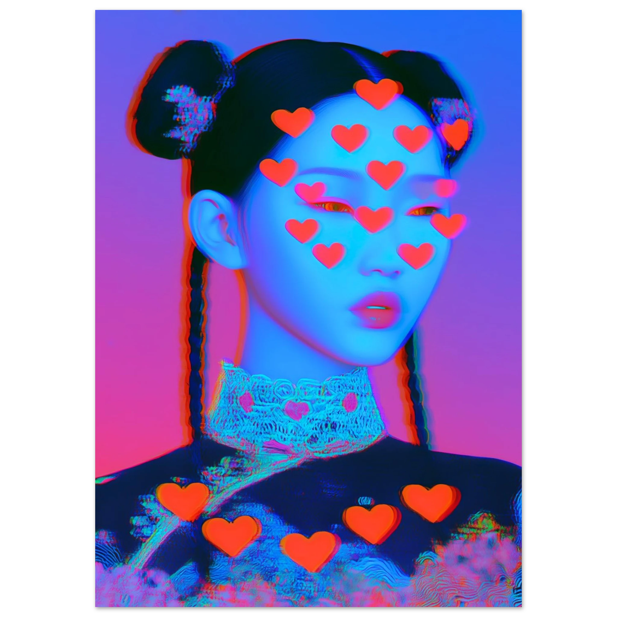 Heart-shaped signals flicker across a serene face, hinting at digital longing and the confusion of affection in a screen-saturated world. Is it love, or just the algorithm playing games again?