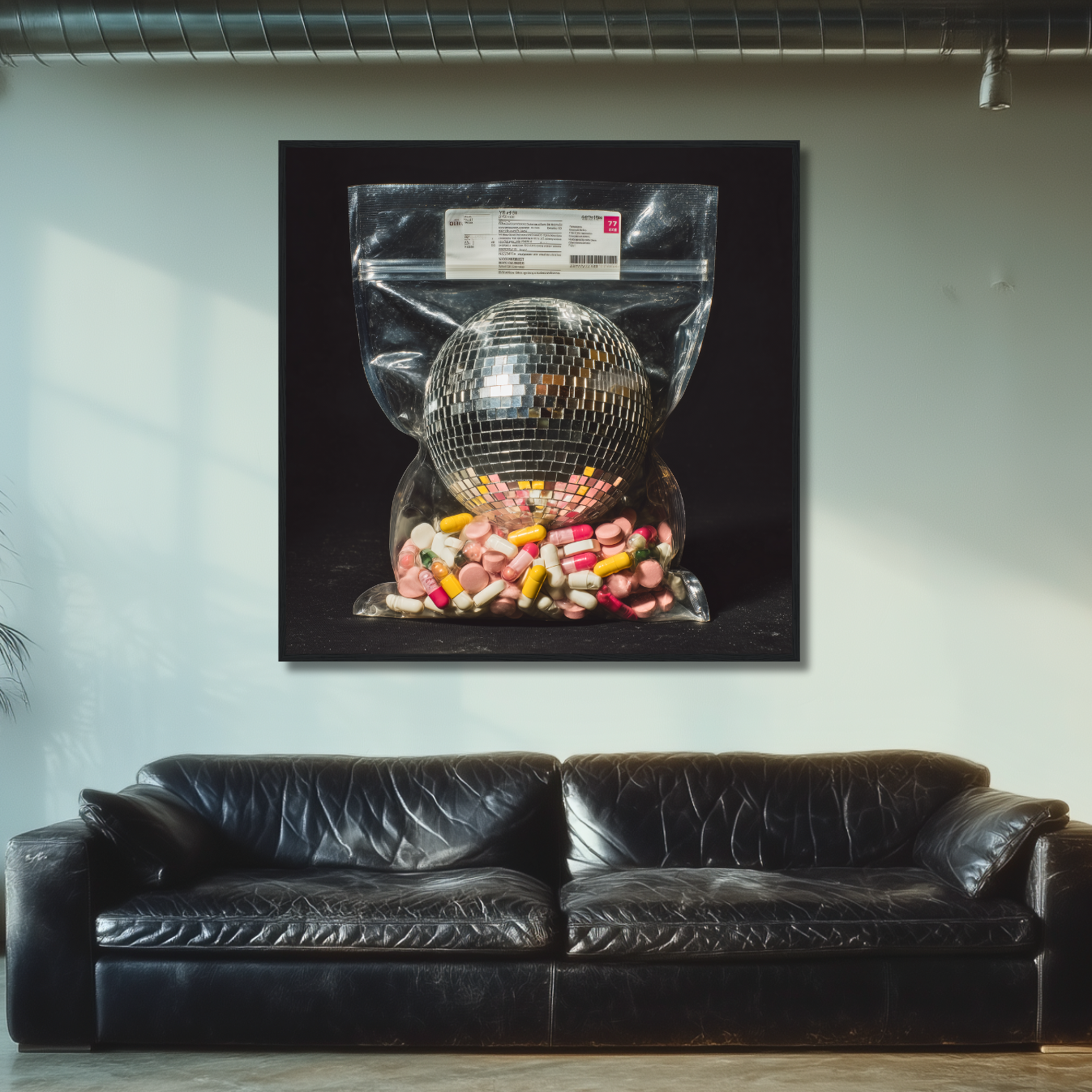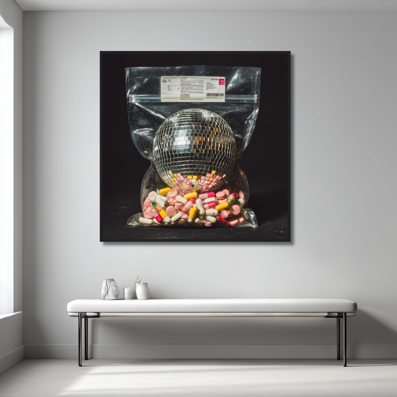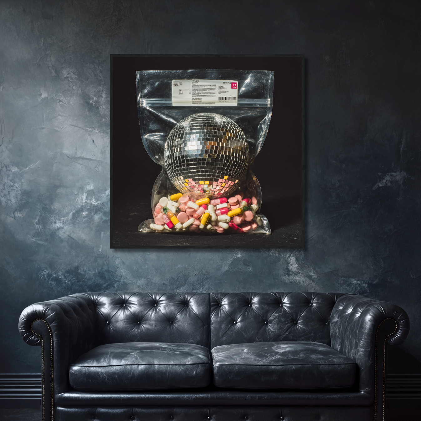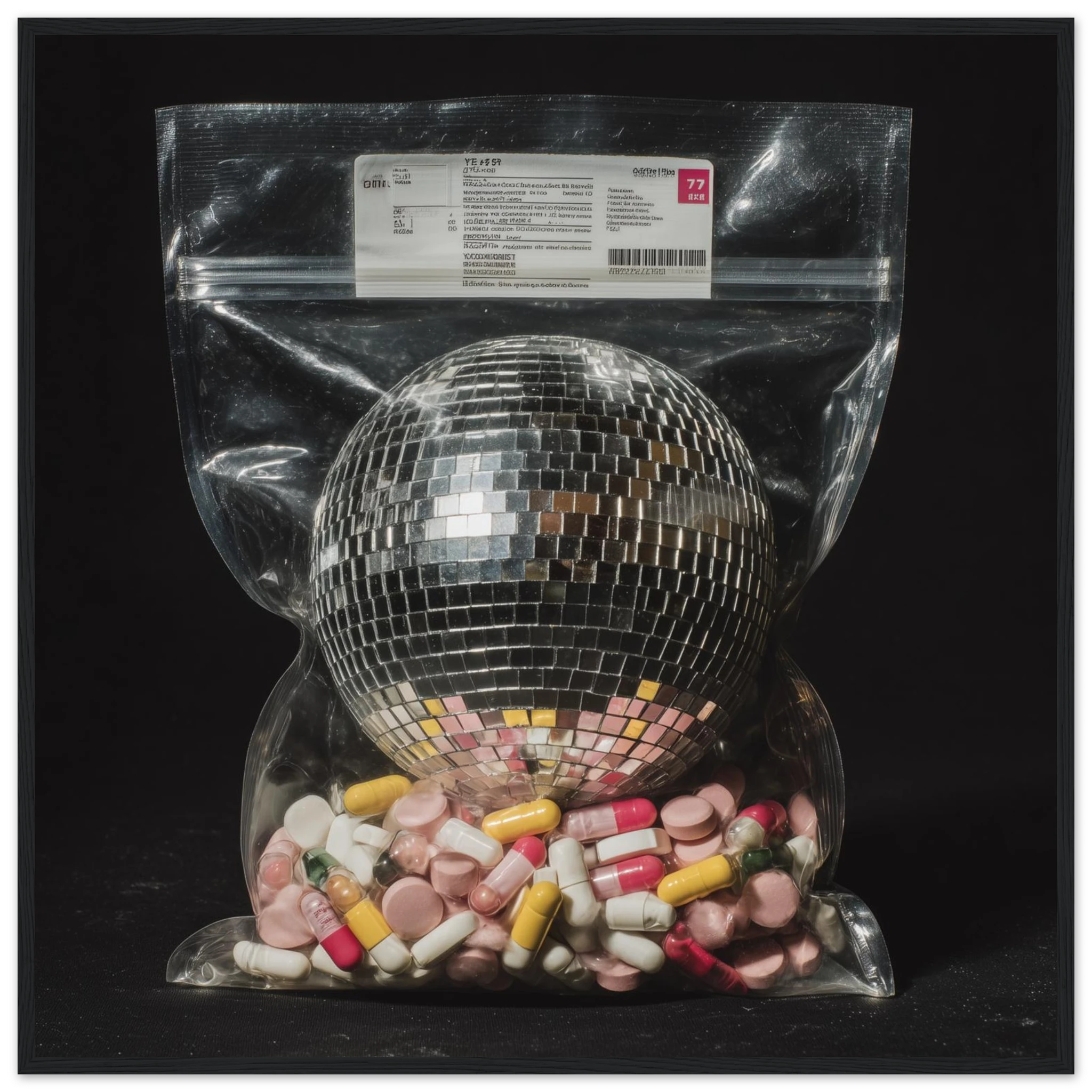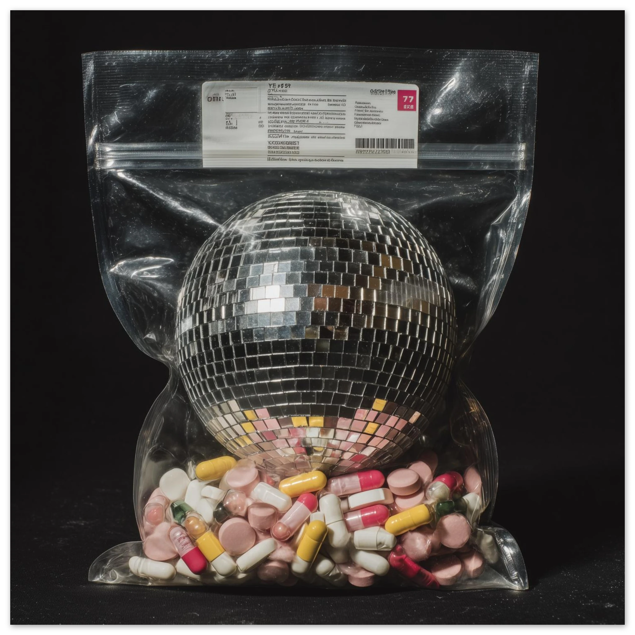 A disco ball sealed in a ziplock, cushioned by a cocktail of pills, this surreal composition captures the blurred line between euphoria and escapism.