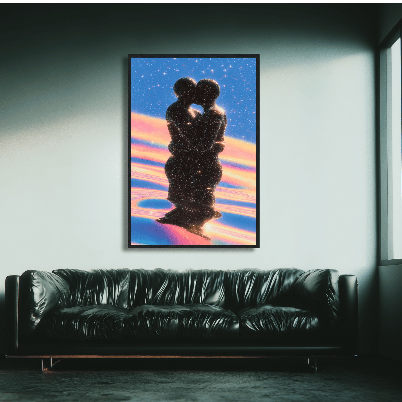 “Stardust Lovers” captures a love story suspended in the infinite, unbound by time, distance, or form. This is cosmic intimacy, a visual poem of connection that defies physics.