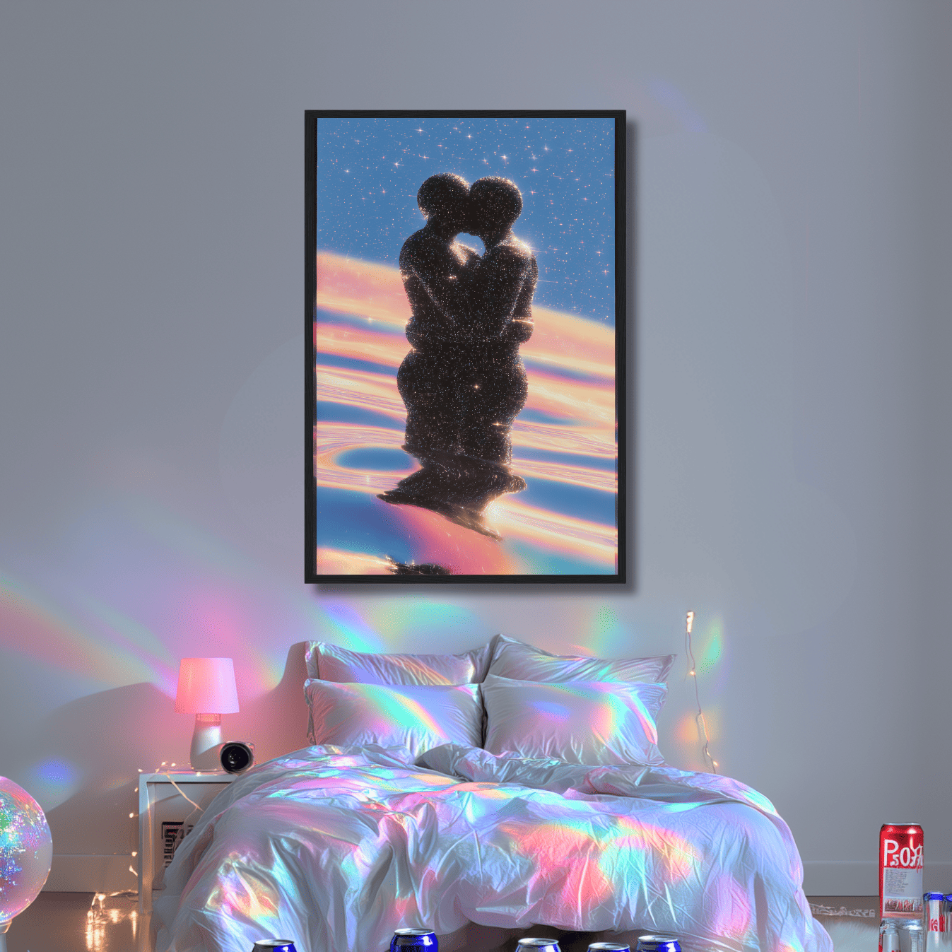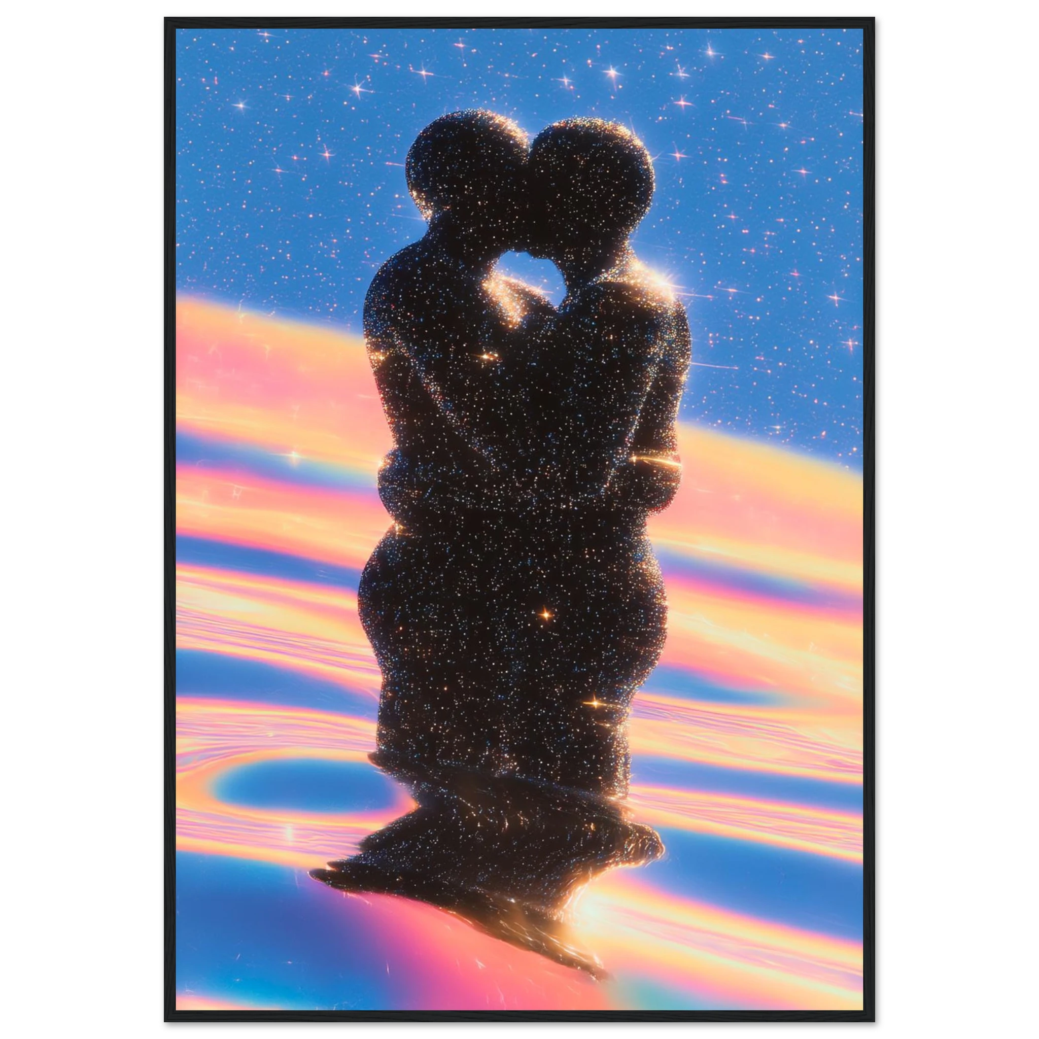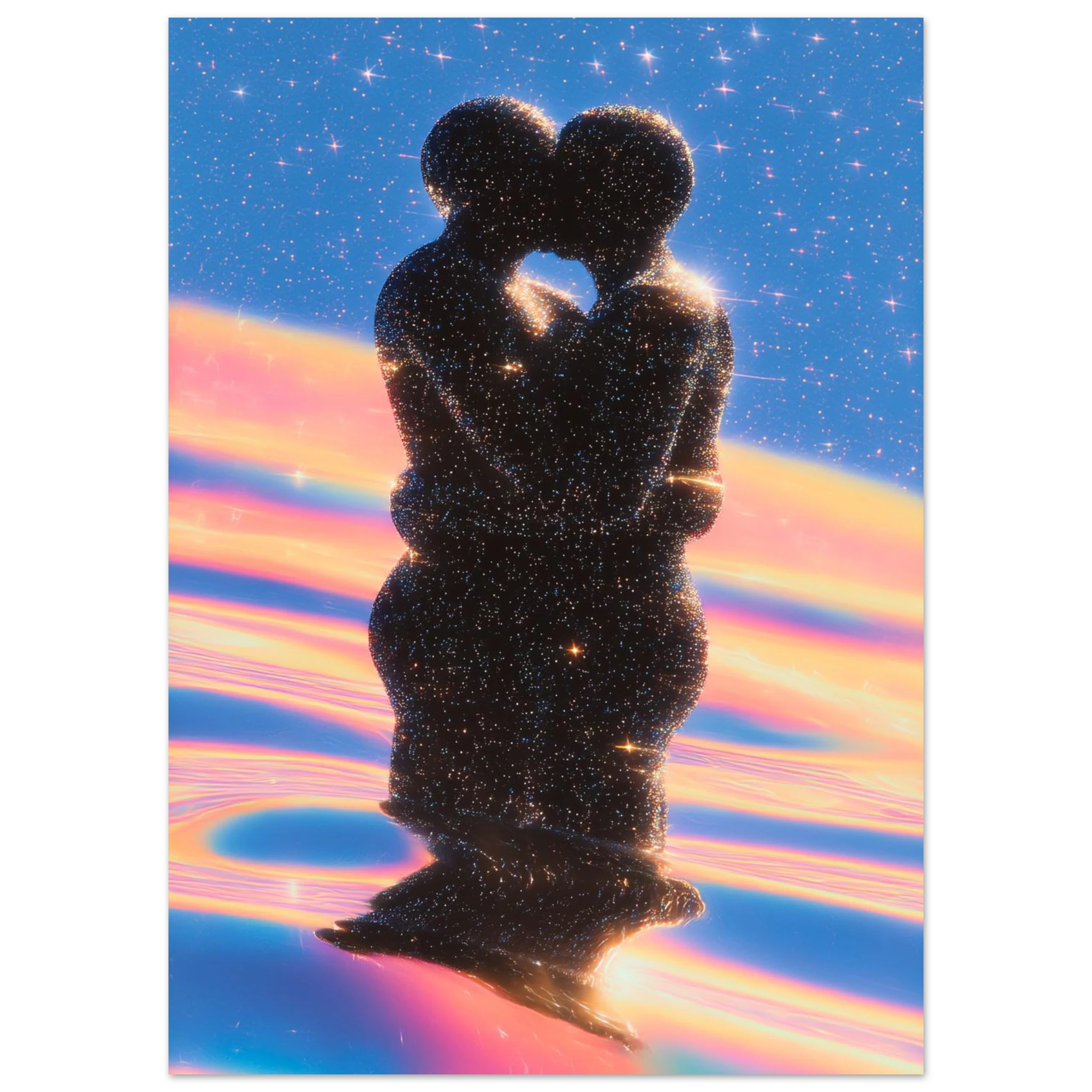 Their bodies shimmer with constellations, their kiss a fusion of galaxies.