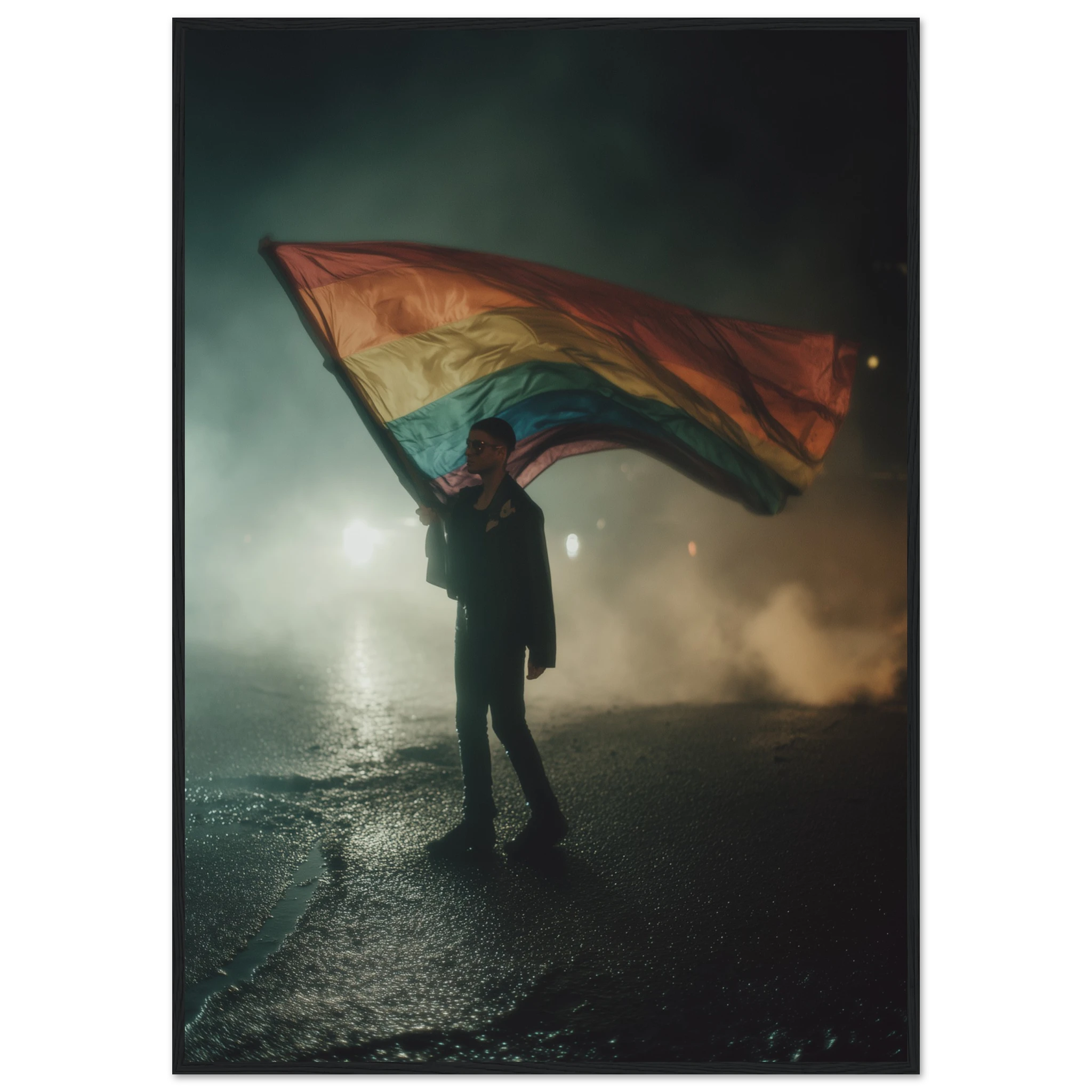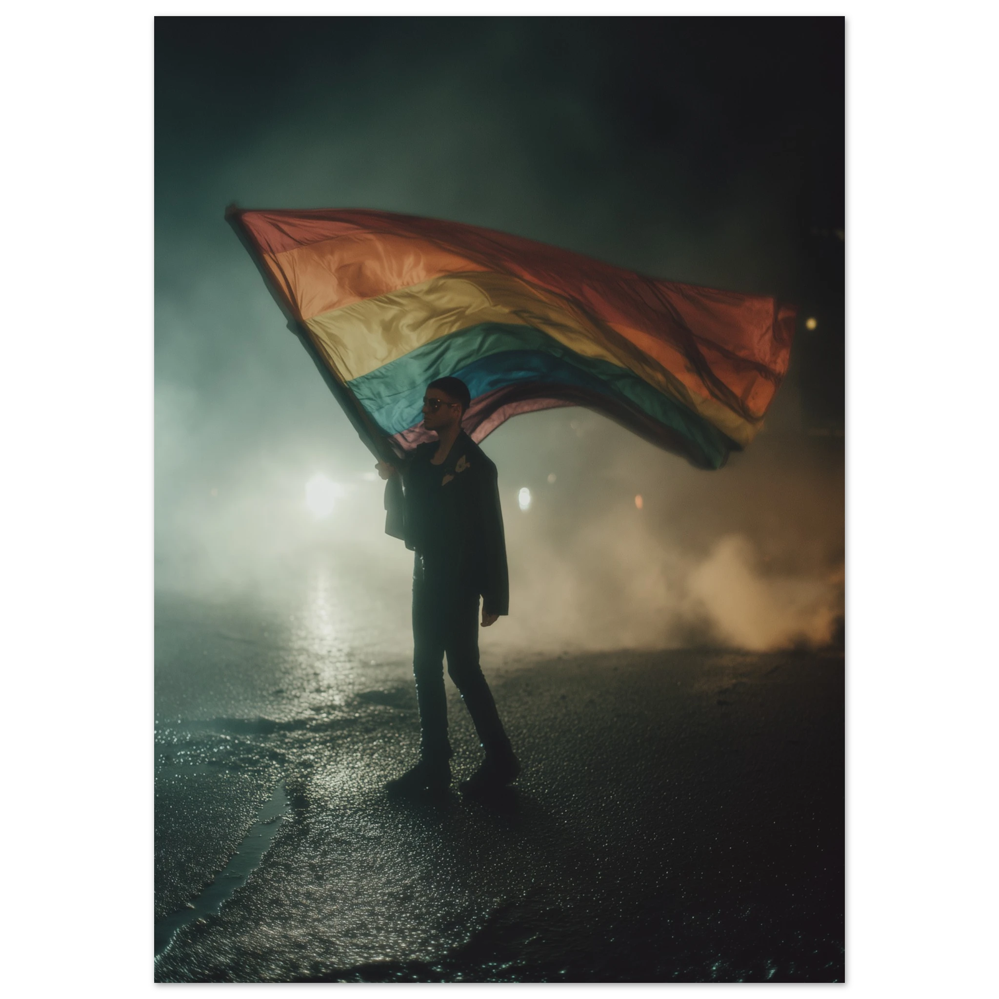 A lone figure walks through smoke and headlights, wrapped in pride and defiance. The flag isn’t just a symbol, it’s armor.